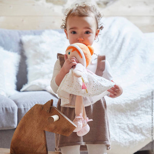 Urocza lalka-przytulanka Valentine francuskiej marki KALOO to idealna pierwsza przyjaciółka Twojego maluszka. Jest niezwykle miękka, piękna, perfekcyjnie wykończona i przede wszystkim całkowicie bezpieczna dla dziecka już od pierwszych dni jego życia. Ma słodką minkę, urocze, duże ciemnoniebieskie oczy, stylowy rudy kok i jasny odcień skóry. Nosi rozkloszowaną sukienkę z białym dołem w złote gwiazdki i futrzaną podszewką, futerkową opaskę z kwiatem (również białym z złote gwiazdki), a na nóżkach ma baletki z wstążkami. Na złotej wstążce pod szyjką lalki znajdziesz miejsce na imię Twojego dziecka, by uczynić tę maskotkę jeszcze bardziej wyjątkową. Jest spora, ale nadal poręczna – ma 32 cm – dla małych rączek. Stworzona do tulenia, usypiania, uspokajania, zabierania na spacery i na dłuższe wyprawy.