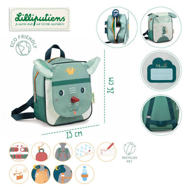 Uroczy i poręczny plecak z kolekcji Smok Joe belgijskiej marki Lilliputiens. Funkcjonalny, lekki i wygodny, idealny do przedszkola i na wycieczki. Ma pastelowo i ciemnozieloną komorę główną w drobną krateczkę, zapinaną na suwak i zewnętrzną kieszonkę z przodu, z klapką z pyszczkiem Smoka Joe (po bogach klapki wszyte są urocze, sterczące smocze uszy) w opasce i z odstającym czerwonym rogiem nad nosem. Po wewnętrznej stronie klapki jest też wizytówka, na której można zapisać imię dziecka i numer kontaktowy rodzica. Plecak posiada komfortowe szelki z regulacją długości. Na klatce piersiowej ma dodatkowy pasek stabilizujący i odciążający plecy, zapinany na łatwy w obsłudze zatrzask, a na górze uchwyt do zawieszenia, np. na haczyku w szatni. Wewnątrz komory głównej znajduje się dodatkowa, niezapinana kieszonka i gumka stabilizująca na butelkę. Plecak pomieści zeszyty czy książeczki formatu A5. Na szelkach znajdują się dodatkowe elementy odblaskowe. Plecaczek uszyto z wysokiej jakości materiałów pochodzących z recyklingu, łatwych do czyszczenia i odpornych na wilgoć. Jest perfekcyjnie wykończony, z dbałością o każdy szczegół i w pełni bezpieczny dla dziecka.