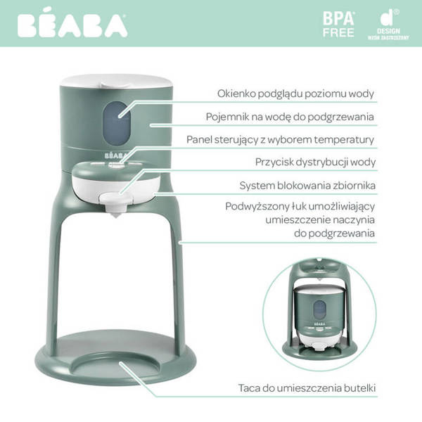 Urządzenie jest w kolorze stonowanej zieleni i bieli. Do produktu możesz dobrać inny od BEABA w tej samej gamie kolorystycznej.