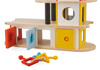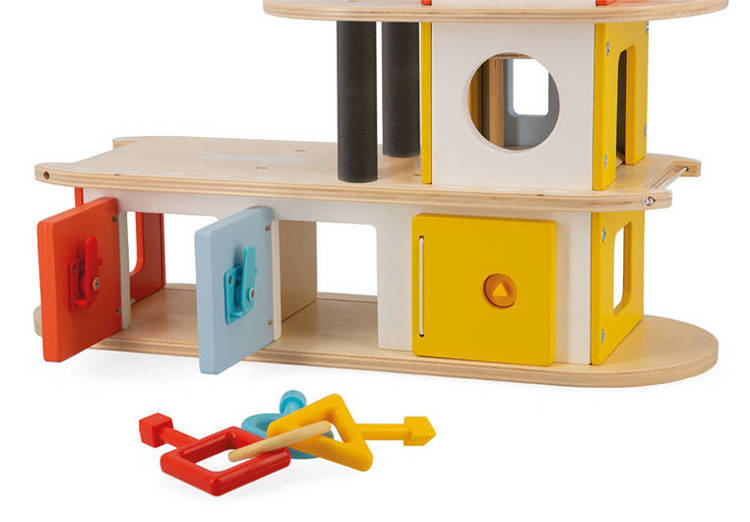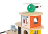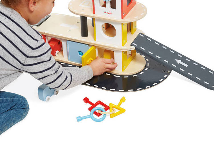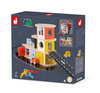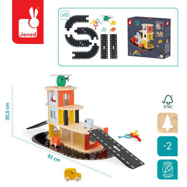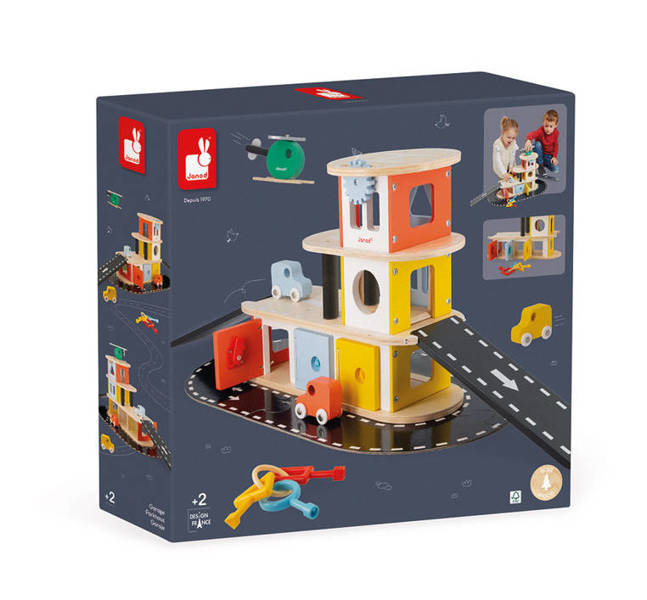 Drewniany piętrowy garaż z serii Bolid francuskiej marki JANOD to idealny prezent dla każdego dziecka. Komplet składa się z kilkupoziomowego (3 kondygnacje!) garażu wraz z akcesoriami: 3 autami i helikopterem. Na najniższym piętrze znajdują się trzy boxy, otwierane dołączonymi do zestawu plastikowymi kluczykami o różnych kształtach geometrycznych (funkcja sortera). Budynek posiada dwa podjazdy, mechaniczną windę (na koło zębate) oraz lądowisko dla helikopterów. Zestaw pozwala na tworzenie wielu scenariuszy zabaw.