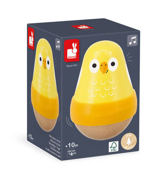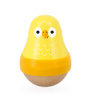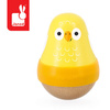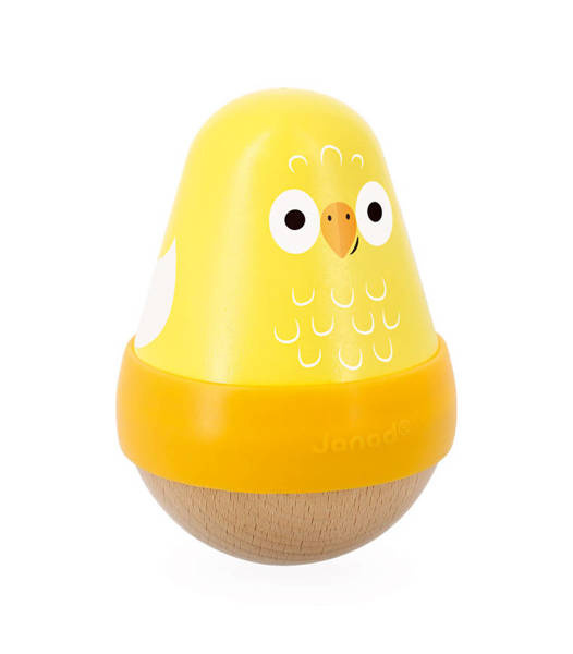 Drewniana wańka-wstańka Ptaszek z serii Tropik francuskiej marki JANOD rozwija u dziecka wiele kluczowych umiejętności, m.in. chwyt, małą motorykę i zmysł słuchu. Zabawka ma postać żółtego ptaszka na jasno-drewnianej zaokrąglonej podstawie, dzięki czemu buja się delikatnie na boki, powracając niezmiennie do pozycji pionowej. Bujana i potrząsana wydaje przyjemny dla ucha dźwięk dzwoneczka. Na środku figurki znajduje się silikonowy pasek, ułatwiający jej chwytanie i utrzymanie w małej dłoni. Zabawka zachwyca estetyką wykonania i pięknymi, intensywnymi barwami.