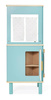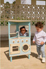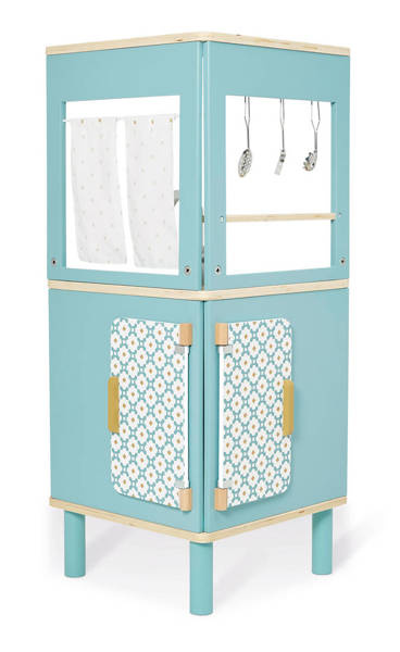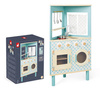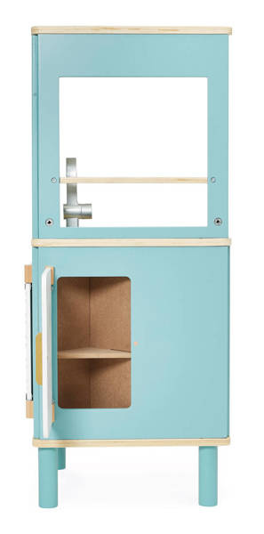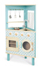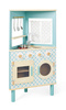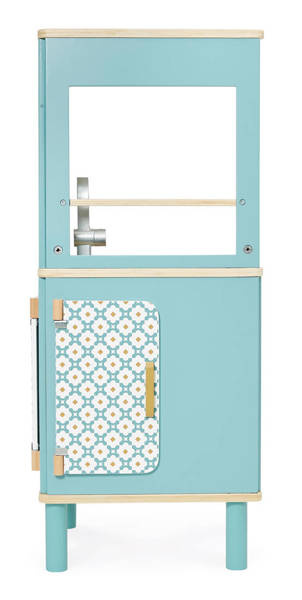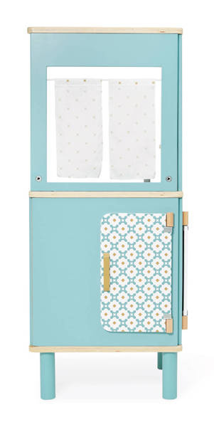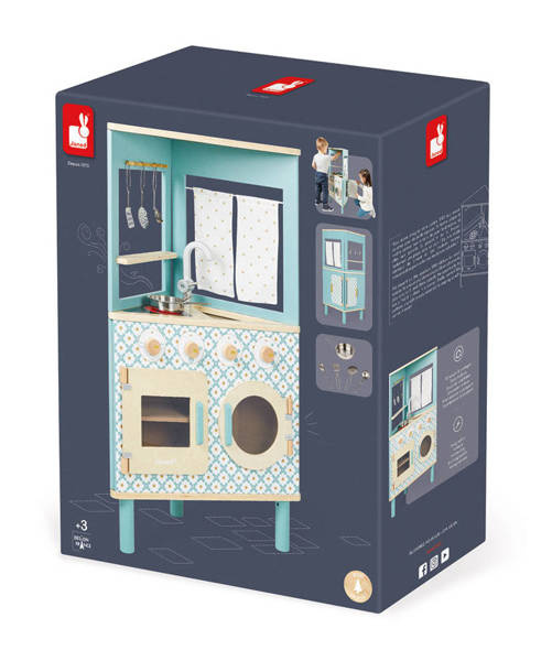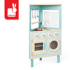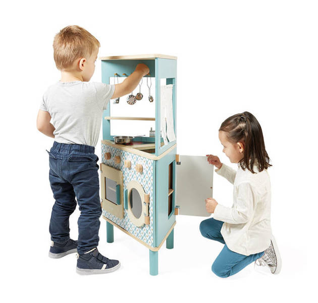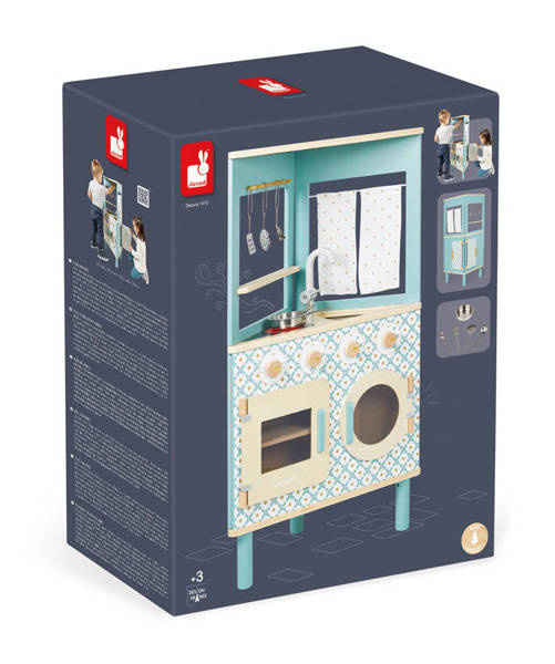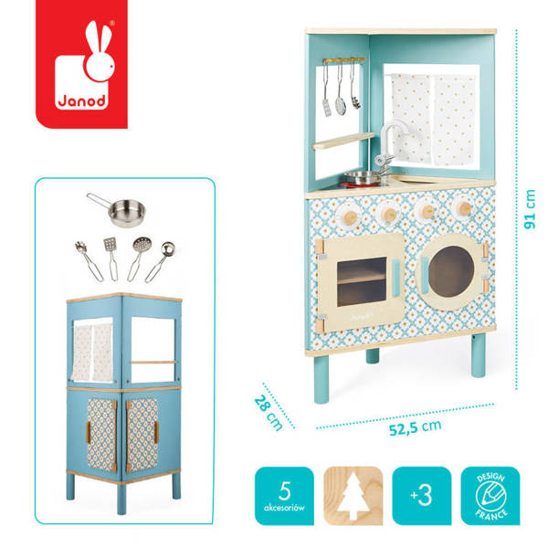 Narożna drewniana kuchnia francuskiej marki JANOD sprawi mnóstwo radości każdemu dziecku, pozwoli mu bezpiecznie uczestniczyć w codziennych czynnościach, czy rozwijać pasję gotowania. W skład zestawu wchodzi przepiękne wielofunkcyjne, trójstronne urządzenie wykonane z giętego drewna. Po jego jednej stronie znajduje się kuchnia z trójkątnym zlewem i kranem, jeden palnik, otwarta półka, wieszak z haczykami na akcesoria kuchenne i okienko z uroczymi białymi zasłonkami w złote kropki. W dolnej części mieści się otwierany piekarnik i pralka. Na dwóch pozostałych ściankach znajdują się dwie dodatkowe otwierane szafeczki. Do kuchni dołączone są też akcesoria: metalowa głęboka patelnia, szpatułka, łyżka do makaronu, łyżka do odcedzania i chochla. Kuchnia wyposażona jest w cztery okrągłe pokrętła. Dzięki swojej wielofunkcyjności, znacznym rozmiarom i wielu akcesoriom może się nią bawić jednocześnie więcej niż jedno dziecko. Zabawka ma piękne kolory: naturalnego drewna i turkusu oraz zdobienia w stylu vintage.