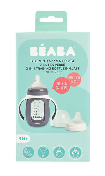 Pojemna, poręczna i lekka szklana butelka treningowa 2w1 francuskiej marki BEABA w specjalnej silikonowej osłonce z dwoma uchwytami, która nie tylko chroni ją przed stłuczeniem, ale także ułatwia dziecku przejście z karmienia na samodzielne picie. Osłonkę można zdejmować, np. do mycia. W komplecie znajduje się ponadto silikonowy smoczek-niekapek (płyn wydostaje się z niego wyłącznie podczas ssania) do używania już od 4. miesiąca życia, oraz ustnik-niekapek dla starszych dzieci. Każda z końcówek ma własną nakrętkę dla wygodnego i bardziej higienicznego wymieniania. W zestawie jest również bezpieczne i szczelne transparentne wieczko. Na ściance butelki znajduje się skala pojemności (do 210 ml), dzięki której można podać maluchowi odpowiednią ilość płynu lub sprawdzić, ile dziecko wypiło. To idealna butelka do nauki samodzielnego picia.
