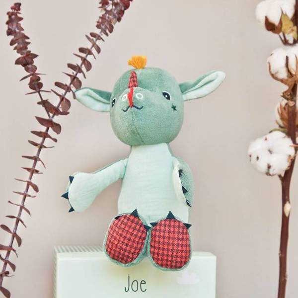 Przytulanka w pudełku Smok Joe belgijskiej marki Lilliputiens to wspaniały pierwszy przyjaciel maluszka. Jest idealny do tulenia, uspokajania i usypiania. Ma postać zielonego smoka o imieniu Joe, 27 cm wysokości i został wykonany z różnych tkanin, by skutecznie stymulować rozwój sensoryczny dziecka. Joe ma kraciaste skrzydełka, spody nóżek i róg na nosie, krótkie pazurki, uszy sterczące na boki, zabawną fryzurkę z żółtych nitek i wystający rozdwojony języczek. Jest solidnie wykonany i bezpieczny. Aktywizuje zmysł dotyku i wzroku, pomaga w zasypianiu i wyciszaniu się.