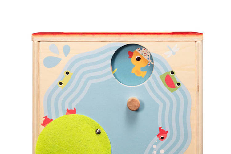• otwór ukryty pod ruchomym, filcowym liściem lilii wodnej oraz stawik z rybkami, które „płyną” poprzez pokręcanie drewnianego bolca,