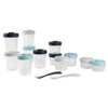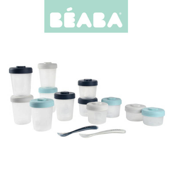 Zestaw 12 słoiczków do porcjowania i przechowywania jedzenia oraz 2 łyżeczki francuskiej marki BEABA. W skład kompletu wchodzą dwa słoiczki o pojemności 90 ml, cztery o pojemności 150 ml, sześć o pojemności 250 ml oraz dwie ergonomiczne pierwsze łyżeczki dla dziecka.