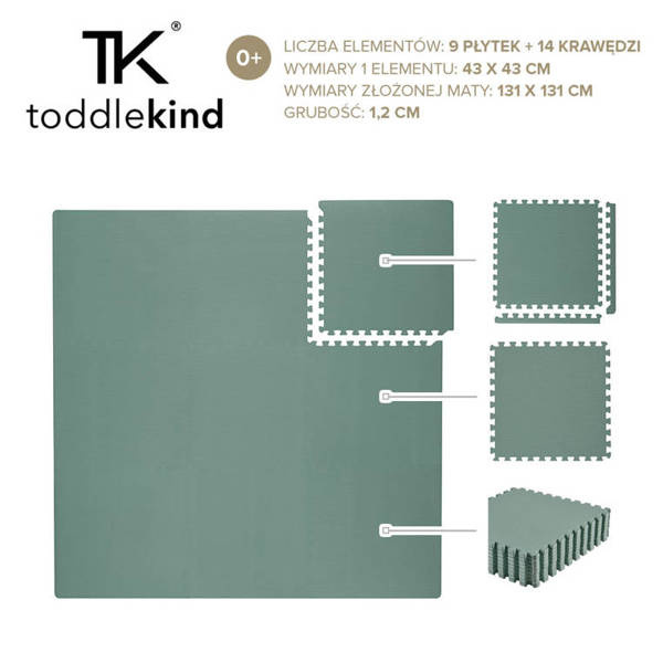 Mata do zabawy Classic Playmat z miękkiej pianki EVA angielsko-niemieckiej marki Toddlekind to praktyczne rozwiązanie, zapewniające miękkie, komfortowe i bezpieczne podłoże do zabawy oraz innych aktywności dla dzieci i niemowląt już od pierwszych dni życia! Zachwyca praktycznością, ergonomicznością, możliwościami konfiguracji, stylowym designem i kolorystyką, dzięki którym można ją dopasować do wystroju każdego współczesnego wnętrza, tworząc elegancką i gustowną przestrzeń w pomieszczeniu. Mata składa się z 9 kwadratowych płytek o grubości 1,2 cm. Dzięki ząbkowanym bokom, łączą się one ze sobą jak puzzle. Jedna zmontowana mata ma wymiary 131x131cm, ale możliwości jej rozbudowy są praktycznie nieograniczone – wystarczy połączyć więcej zestawów razem, aby znaleźć optymalną wielkość maty. W zestawie znajduje się również 14 wykończeniowych obrzeży do stworzenia jednolitej ramy „dywanu”. Optymalny rozmiar i miła dla skóry, aksamitna powłoka czynią matę idealnym miejscem do zabawy, wypoczynku, zdobywania nowych doświadczeń i umiejętności, np. raczkowania czy trenowania chodzenia, już od pierwszych dni życia maluszka. Jest ona wygodna także dla rodzica, stanowiąc m.in. świetne zabezpieczenie dla kolan. Wyprodukowana została z bezpiecznego, nietoksycznego materiału, spełnia najbardziej restrykcyjne normy bezpieczeństwa, które obowiązują w Unii Europejskiej, a nawet – znane z jeszcze większych wymagań – francuskie standardy. Mata idealnie nadaje się na prezent.