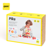 Seria Piks to pierwsza i obecnie flagowa kolekcja marki, zaprojektowana w celu rozwijania uwagi i koncentracji u dzieci. Zestawy klocków i kart oferują zawsze kilka opcji kreatywnej i angażującej zabawy, ale są też doskonałym narzędziem terapeutycznym. Powstają z naturalnego litego drewna bukowego, pochodzącego z odpowiedzialnych źródeł (FSC) i nietoksycznego silikonu, zgodnego z europejską dyrektywą RoHS.