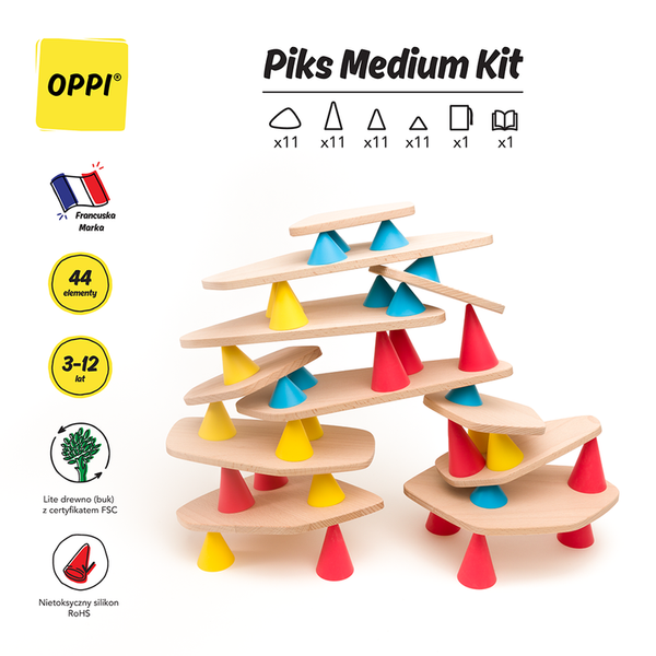 Zestaw konstrukcyjny Piks Medium francuskiej marki OPPI to innowacyjna wielofunkcyjna zabawka, przeznaczona do rozwijania koncentracji, zdolności motorycznych i kreatywności u dzieci.