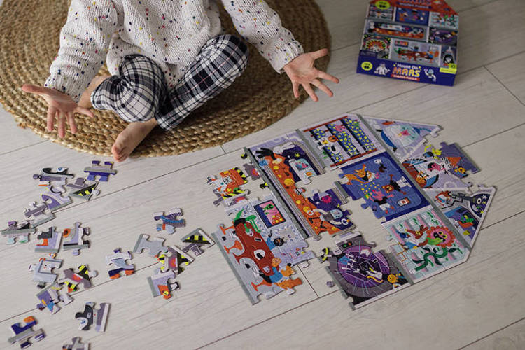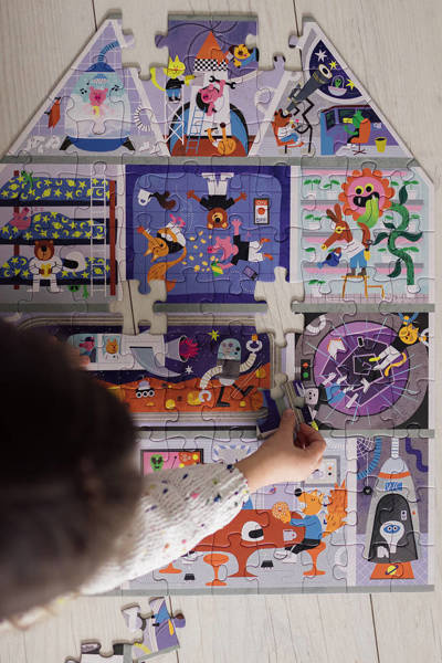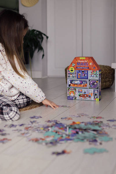 Puzzle konturowe Dom na Marsie amerykańskiej marki MUDPUPPY nadają układaniu puzzli nowy wymiar – na samym złożeniu obrazka zabawa się bowiem nie kończy. Układanka składa się ze 100 elementów, które po złożeniu mają kształt sporego (43 x 56 cm)... domu! Są w nim aż trzy kondygnacje i użytkowy strych, na którym również niemało się dzieje. Kosmiczne kolory i motywy, futurystyczne kształty mebli, zmutowane rośliny, obserwatorium i garaż na rakietę to tylko niektóre z detali, pojawiających się na ilustracji i zachwycających swoją pomysłowością. Układanie tych wyjątkowych puzzli to doskonała rozrywka dla całej rodziny.
