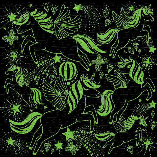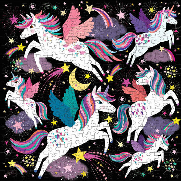 Puzzle rodzinne świecące w ciemności Jednorożce amerykańskiej marki MUDPUPPY nadają układaniu puzzli nowy wymiar – na samym złożeniu obrazka zabawa się bowiem nie kończy. Układanka składa się z 300 elementów, które po ułożeniu tworzą duży obrazek o wymiarach 48 x 48 cm. Przedstawiają piękne, bajecznie kolorowe i radosne jednorożce na tle czarnego nieba. Różnorodne wzory świetnie stymulują pracę oka. To jednak nie wszystko. Kiedy robi się ciemno, zarówno zwierzęta, zwłaszcza ich bujne grzywy i ogony, jak i wiele innych elementów... świecą! Co więcej – obrazek się zmienia, np. jednorożce, które były aktywne w ciągu dnia, w nocy usypiają, a budzą się te, które dzień przespały. Puzzle te to niebanalny pomysł na rodzinną rozrywkę. Zaciekawią i zachwycą wszystkich.