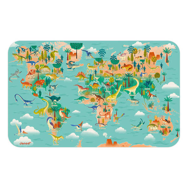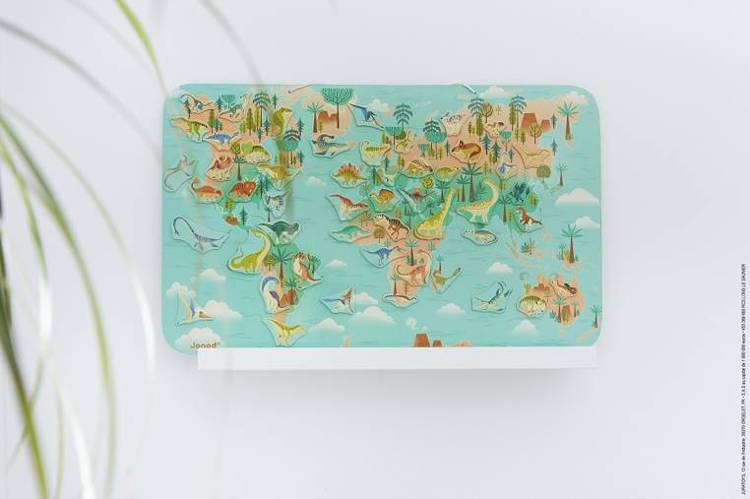 Magnetyczna układanka mapa świata z kolekcji Dinozaury francuskiej marki JANOD to doskonała zabawka, rozwijająca kreatywność i wyobraźnię. Zabawa polega na układaniu magnesów na dużej drewnianej planszy z piękną grafiką prehistorycznej mapy świata, utrzymanej w barwach kolekcji, tj. odcieniach pomarańczu i turkusu. W zestawie jest aż 50 magnesów, przedstawiających różne gatunki dinozaurów, które należy umieszczać na mapie, zgodnie z rejonem ich występowania. Układanka ta będzie służyć dziecku przed bardzo długi czas i nieprędko się znudzi. Jest doskonale wykonana, co dodatkowo rozbudza zmysł estetyczny, a ponadto ćwiczy sprawność manualną dziecka. To także świetny sposób na naukę paleontologii. Planszę można zawiesić na sznurku. Zabawka została zaprojektowana we Francji. Idealnie nadaje się na prezent.