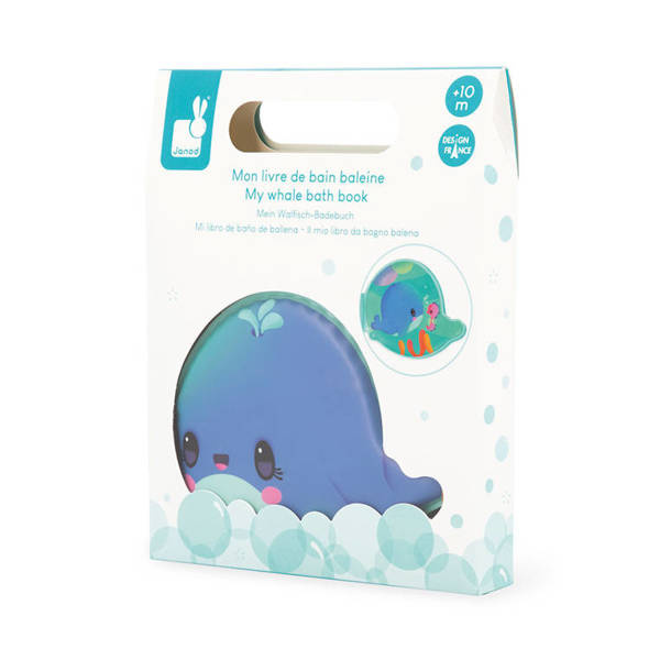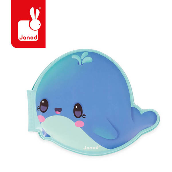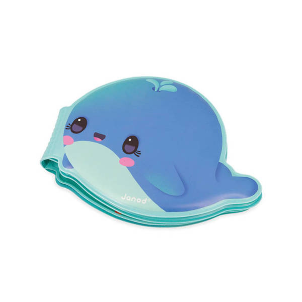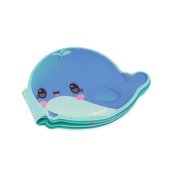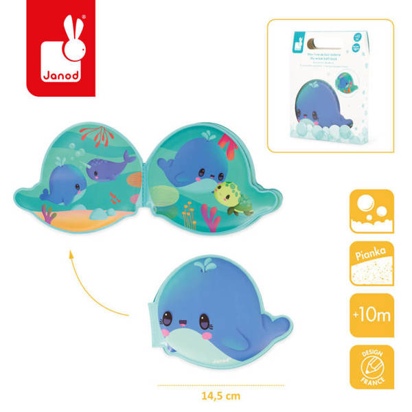 Książeczka do kąpieli Wieloryb francuskiej marki JANOD wykonana została z wodoodpornego, łatwego do czyszczenia, szybkoschnącego tworzywa. Ma oryginalny kształt uroczego wieloryba, a na jej kolejnych stronach znajdują się przygody głównego bohatera i jego spotkania z innymi podwodnymi stworzeniami, m.in. z żółwiem czy narwalem. Książeczka jest w pełni bezpieczna dla dziecka. Rozwija spostrzegawczość i pobudza wyobraźnię. To idealny prezent dla dziecka, które uwielbia opowiadać własne historie oraz wspaniały umilacz czasu, spędzanego w wannie. Zabawka została zaprojektowana we Francji.
