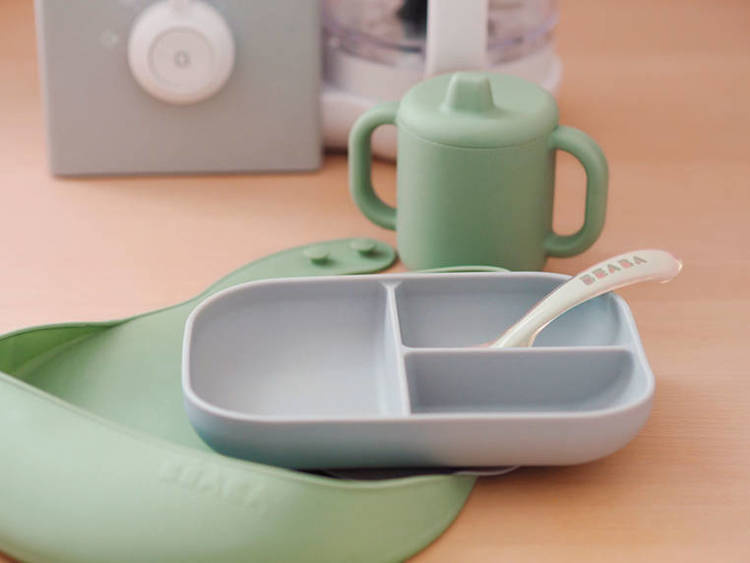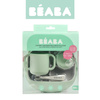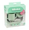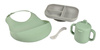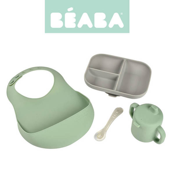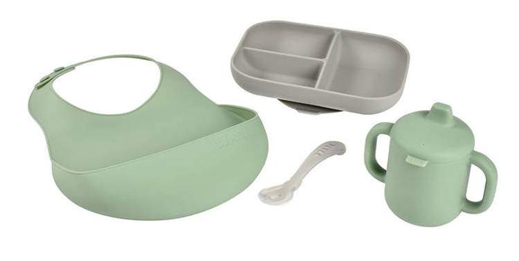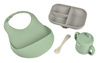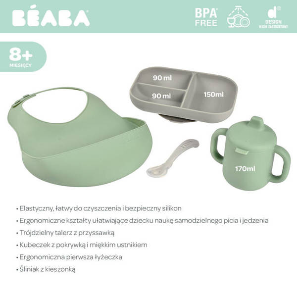 Silikonowy zestaw do posiłków francuskiej marki BEABA składa się z trójdzielnego talerzyka, kubka z pokrywką z ustnikiem, łyżeczki treningowej 2. stopnia i śliniaka z kieszonką. Wszystkie elementy zestawu charakteryzuje ergonomiczny, zaokrąglony kształt i miękkie, gładkie brzegi.