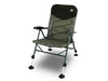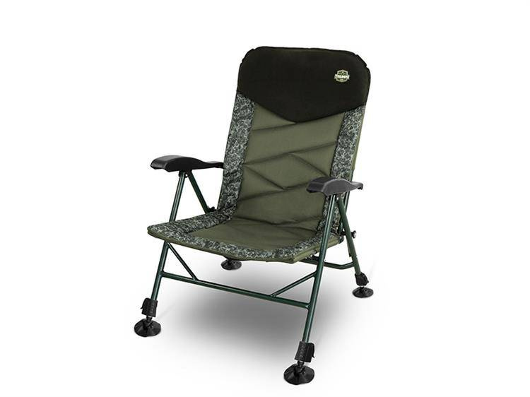 Regulowany mechanizm umieszczony w podłokietnikach fotela pozwala na zmianę kąta oparcia w zależności od potrzeb wędkarza. Maksymalny komfort dla głowy i szyi zapewnia dodatkowo wyściełana część polarowa w ciemnozielonym kolorze, na której znajduje się logo produktu. Materac w obszarze pleców i siedziska wykonany jest z wytrzymałej tkaniny 600D z unikalnymi ukośnymi szwami. Krawędzie pokryte są tkaniną 600D z opatentowanym kamuflażem C2G. Aby umilić czas pomiędzy połowami, krzesło wyposażone jest w ergonomicznie wyprofilowane podłokietniki zapewniające doskonały komfort podczas odpoczynku i obserwacji otaczającej przyrody.