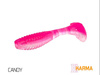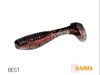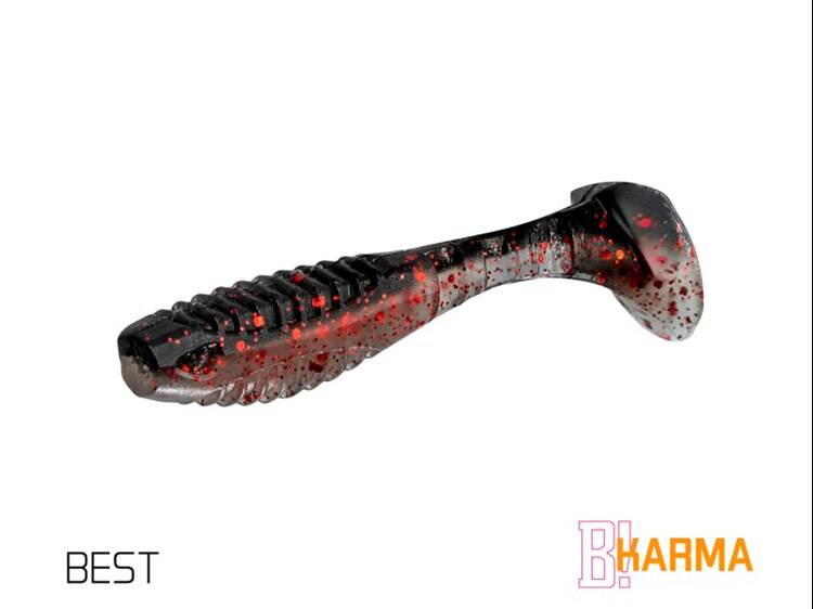 Od początku projektowaliśmy KARMA jako nietypowy model klasycznego produktu. Naszym celem było stworzenie wszechstronnej przynęty, ale zrobienie tego na swój własny sposób. Pierwszą rzeczą, jaką można zauważyć, jest niezwykły stosunek ogona do ciała. Większy ogon powoduje nietypowy ruch przynęty, kiedy ogonek porusza się, a tułów delikatnie przetacza się z jednej strony na drugą, imitując zranioną ofiarę. Taki ruch niezwykle dobrze przyciąga ryby i daje nowe możliwości prezentacji przynęty. Pomiędzy tułowiem a ogonem znajdują się trzy nacięcia dodające bardziej naturalnego wyglądu, a sam tułów jest ząbkowany na brzuchu i tylnej części. Ten rodzaj powierzchni zwiększa wibracje w wodzie i z powodu nacięć; zawsze widać, gdzie włożyć haczyk i gdzie opuszcza ciało. Przednia część przynęty posiada nacięcie, aby lepiej dopasować główkę jigową.