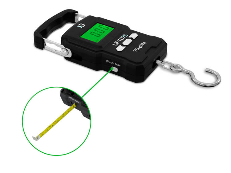 Jeśli istnieje idealna waga dla wędkarza, to z pewnością jest to LIFTO! Ta akumulatorowa waga cyfrowa umożliwia ważenie w zakresie od 10g do 75kg z dużą dokładnością. LIFTO posiada proste sterowanie za pomocą trzech przycisków. Włączenie lub wyłączenie wagi odbywa się poprzez naciśnięcie środkowego przycisku oznaczonego jako Power ON. Krótkie naciśnięcie przycisku UNIT pozwala zmienić jednostki wagi (kg, lbs, JIN, oz) wyświetlane na ekranie. Czwarte naciśnięcie przycisku UNIT przełącza wagę w tryb termometru, który wyświetla aktualną temperaturę w °C. Można wyłączyć podświetlenie wyświetlacza podczas jasnego światła dziennego, przytrzymując przycisk UNIT przez 2 sekundy, co przyczynia się do oszczędności baterii. Funkcja TARE pozwala na wyzerowanie wagi na haku, co jest przydatne przy ważeniu ryb bez przekłamującej wagę torebki wagowej.