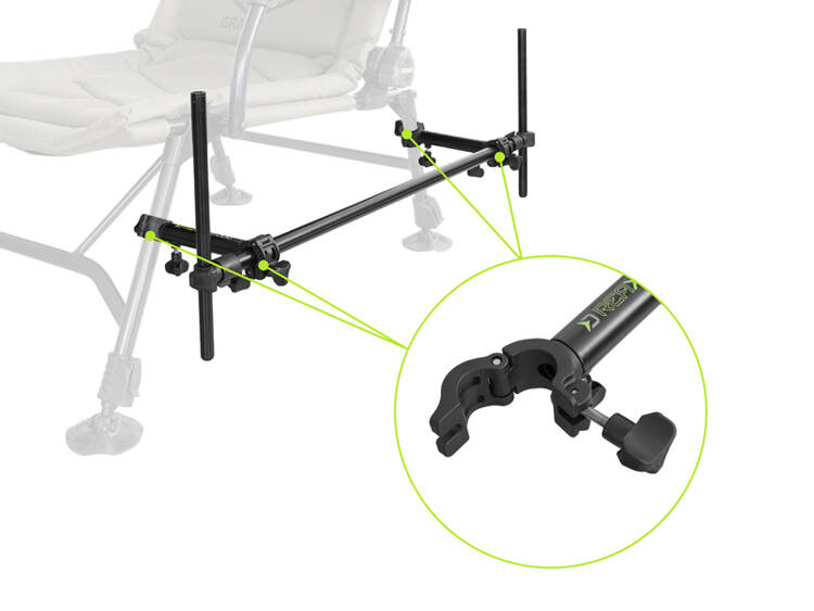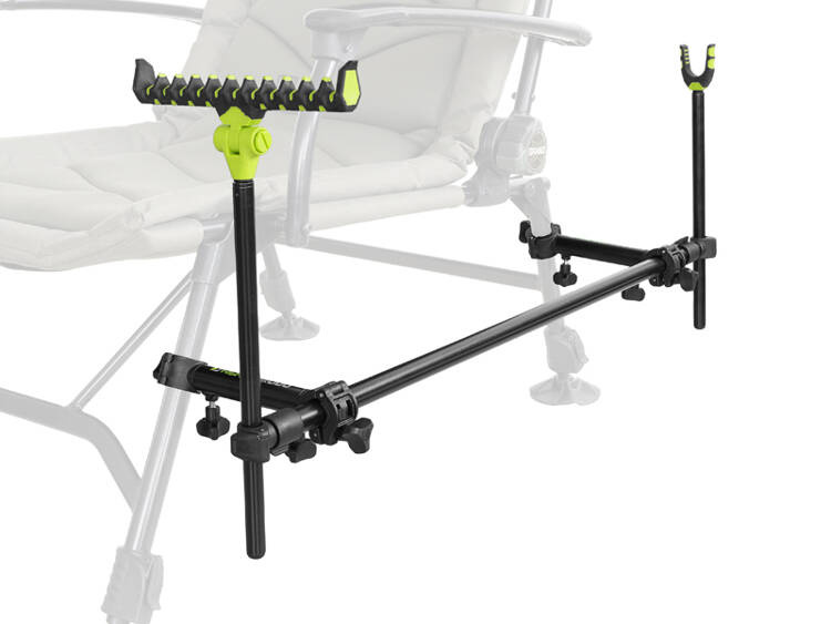 Uchwyt jest wszechstronny, mocowania można przesuwać i obracać w celu łatwiejszego zamocowania na krzesłach. Na obu końcach produktu znajdują się pręty w plastikowych klipsach, które mogą poruszać się w pionie lub obracać. Górna część prętów ma uniwersalny gwint do różnych typów uchwytów na wędki. Uchwyt jest teleskopowy na obu końcach i można go przedłużyć w zależności od potrzeb.