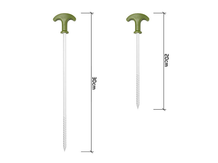 Zestaw zapasowych szpilek, których można użyć do uzupełnienia lub wymiany szpilek do namiotu, parasola lub innego rodzaju schronienia. Mają zielone plastikowe nakładki, które nie poluzują się ani nie zsuną w dół nawet po wielokrotnym wbiciu w ziemię. Szpilki z wytrzymałym czterostronnym kolcem ułatwiają penetrację twardej i suchej gleby. Szpilki są dostarczane z osłonami transportowymi zapewniającymi ochronę.