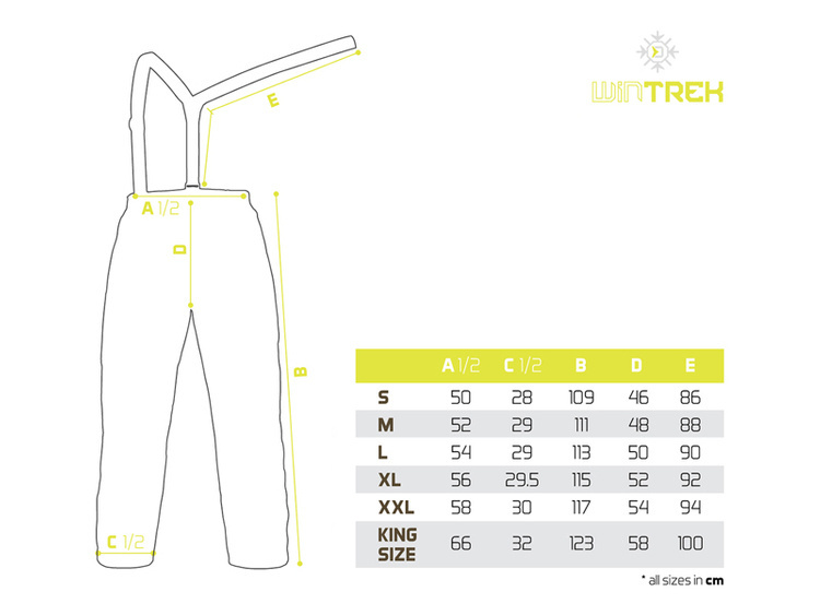Spodnie WinTREK posiadają zapinane na zamek kieszenie po obu stronach, z suwakami przeszytymi efektownym żółtym materiałem i pokrytymi wodoodporną lamówką. W pasie znajdują się regulowane elastyczne szelki, które można dopasować do wzrostu lub całkowicie odpiąć. Sama talia ma zintegrowaną gumkę, zwiększającą jej elastyczność i rozciągliwość. Wewnętrzna strona jest wykonana z gładkiego pikowanego materiału.