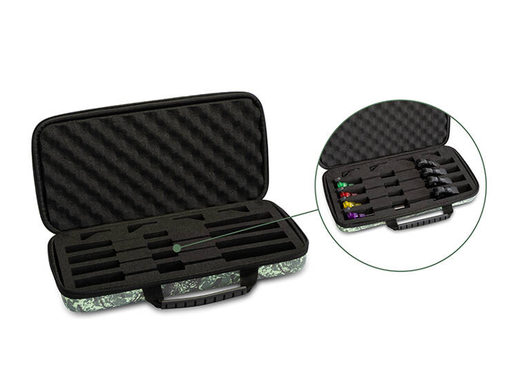 Na utwardzonej piance znajdują się cztery uniwersalne wycięcia na sygnalizatory brań, takie jak CARPY, TRYO, SKIPER, ale także na podobne sygnalizatory dostępne na rynku. Górna część posiada piankowe wypełnienie, które utrzymuje sygnalizatory na miejscu, dzięki czemu nie ulegną one uszkodzeniu ani nie wypadną podczas transportu.