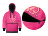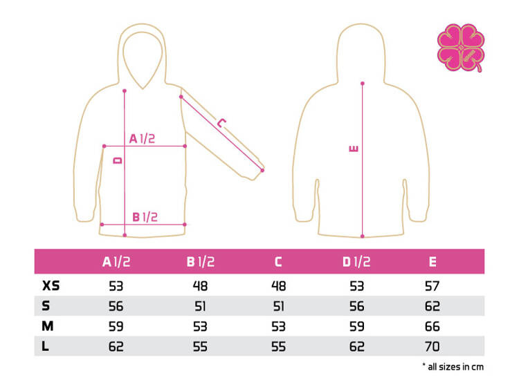 Bluza z kapturem ma dużą zamykaną kieszeń z przodu z wysokiej jakości podwójnym zamkiem błyskawicznym. Boczne kieszenie zapewnią ciepło w chłodniejsze dni. Kaptur jest różowy z zewnątrz i czarny od wewnątrz z logo Delphin i żółtą czterolistną koniczyną. Posiada również czarny sznurek ściągający. Bluza ma dopasowany elastyczny pas i mankiety.