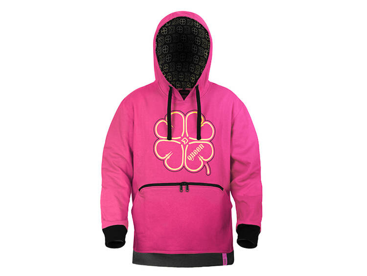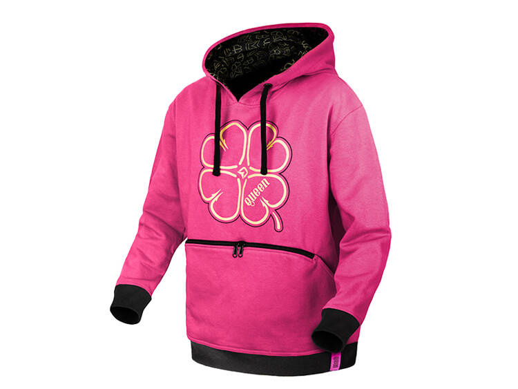 Bluza z kapturem ma dużą zamykaną kieszeń z przodu z wysokiej jakości podwójnym zamkiem błyskawicznym. Boczne kieszenie zapewnią ciepło w chłodniejsze dni. Kaptur jest różowy z zewnątrz i czarny od wewnątrz z logo Delphin i żółtą czterolistną koniczyną. Posiada również czarny sznurek ściągający. Bluza ma dopasowany elastyczny pas i mankiety.