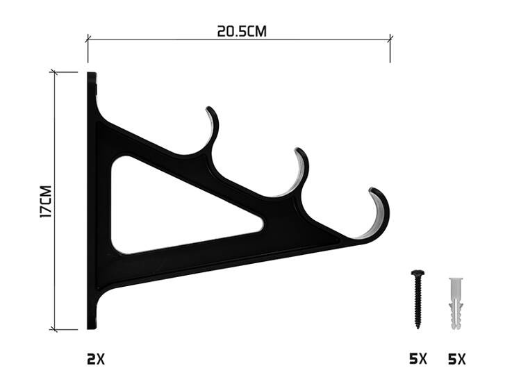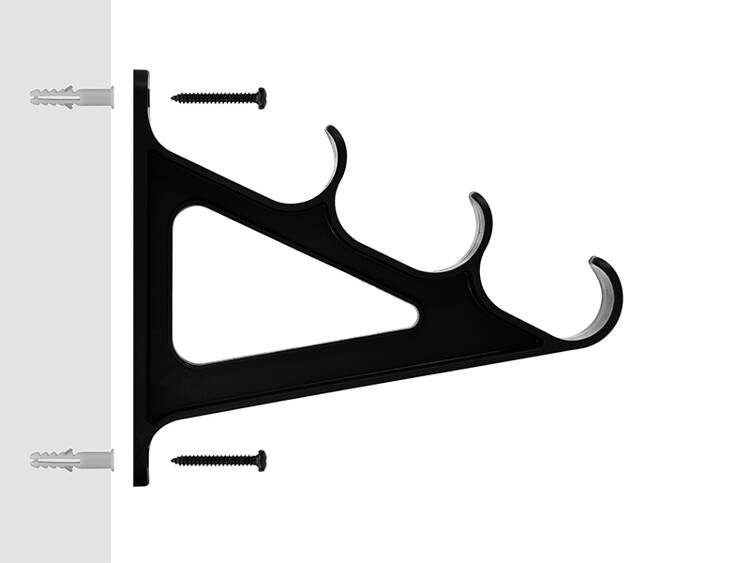 Każdy uchwyt ma dwa otwory umożliwiające przymocowanie go do ściany lub perforowanego panelu. Produkt zawiera 5 kołków rozporowych i wkrętów, dzięki czemu do jego montażu wystarczy wiertarka i śrubokręt.