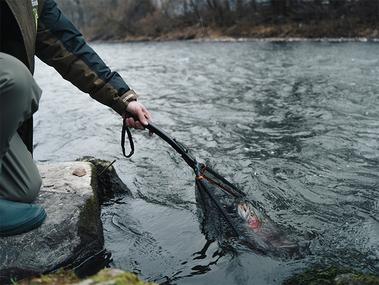 Jest to praktyczny podbierak, szczególnie ceniony przez spinningistów i muszkarzy łowiących w wodach płynących. Dzięki kompaktowym rozmiarom i klipsowi na uchwycie można go przymocować do paska spodni do brodzenia, dzięki czemu jest natychmiast dostępny. Prosty mechanizm pozwala na szybkie rozkładanie i składanie jedną ręką, co jest szczególnie przydatne podczas przenoszenia ryby stojąc w wodzie. Miękka, gumowana siatka jest delikatna dla ryb i nie pochłania nieprzyjemnych zapachów.