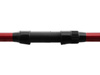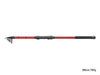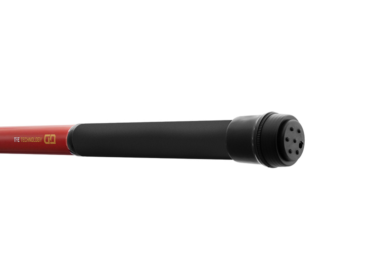 zapewniające płynny przepływ linki podczas rzutu. Uchwyt kołowrotka został zaprojektowany tak, aby bezpiecznie utrzymywać nawet kołowrotki o dużej pojemności. Teleskopowe sekcje i przelotki są utrzymane w czarnej kolorystyce, co w połączeniu z bordowo-czerwonym blankiem na dolnej sekcji tworzy elegancką całość wizualną. Dolna część rękojeści wykonana jest z termokurczliwego materiału.