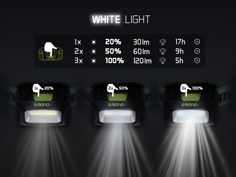 Białe światło oferuje trzy tryby świecenia. Jednokrotne naciśnięcie przycisku zasilania włącza czołówkę z intensywnością 20%, trwającą do 17 godzin. Ponowne naciśnięcie aktywuje drugi tryb z intensywnością 50% i jasnością 60 lumenów, zapewniając 9-godzinną żywotność baterii. Trzecie naciśnięcie przełącza na najmocniejszy tryb o intensywności 100%, trwający 5 godzin. Dłuższe przytrzymanie przycisku aktywuje zielone światło, które ma dwa tryby. W pierwszym trybie świeci z intensywnością 100% przez 12 godzin, a ponowne naciśnięcie przycisku zmniejsza intensywność do 50%, wydłużając żywotność baterii do niewiarygodnych 40 godzin. Jedną z zalet zielonego światła jest to, że nie przyciąga irytujących owadów, co jest szczególnie przydatne podczas gorących letnich wieczorów.