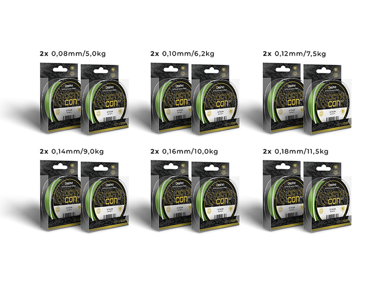 Poznaj pełną gamę dostępnych średnic w praktycznym zestawie – limitowany zestaw żyłek Delphin OctaCON w promocyjnej cenie zawiera wszystkie dostępne średnice żyłki, po dwie sztuki z każdej, w tym samym kolorze.
