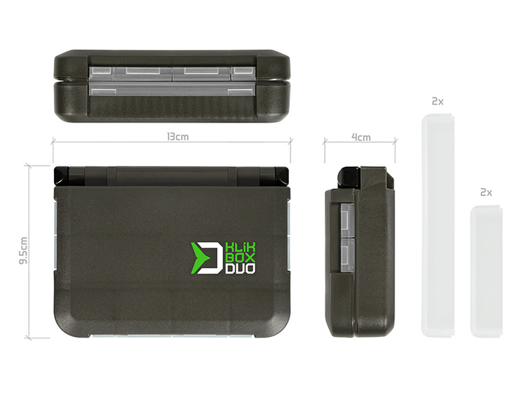 Kompaktowy organizer zaprojektowany głównie z myślą o przechowywaniu małych akcesoriów wędkarskich, które są niezbędne przy wiązaniu zestawów końcowych. Nazwa Duo sugeruje, że przestrzeń do przechowywania znajduje się po obu stronach pudełka.