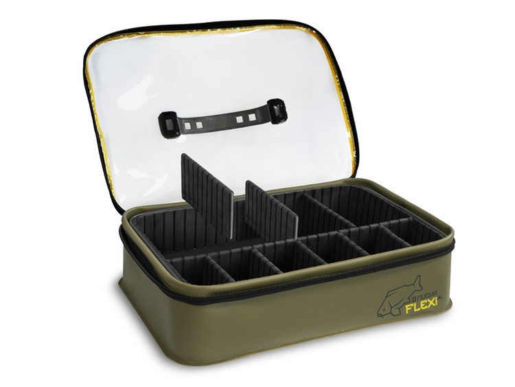 Delphin NuEVA FLEXI to sprytnie zaprojektowany organizer wykonany z materiału EVA, który pozwala na przechowywanie szerokiej gamy akcesoriów wędkarskich – od ciężarków po przynęty.