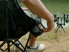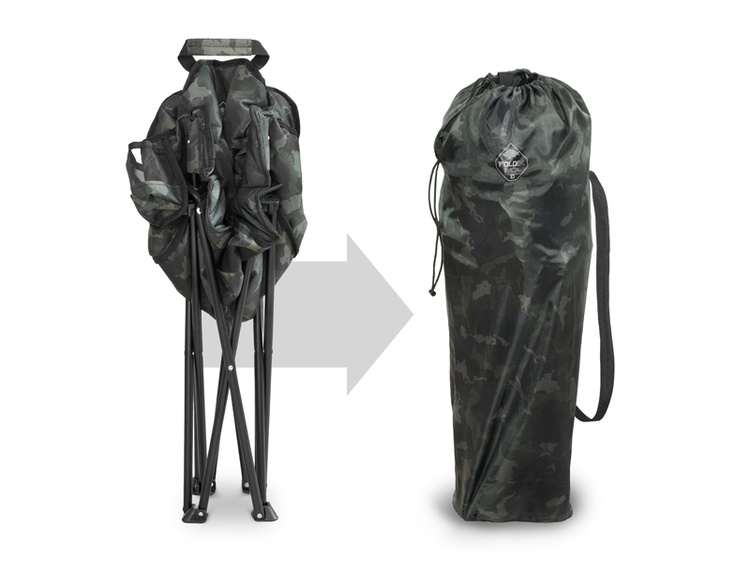 Z boku fotela znajduje się praktyczna kieszeń, która pomieści ulubiony napój, telefon lub drobne akcesoria. Aby ułatwić przenoszenie, model FOLDIX został wyposażony w wygodny uchwyt oraz paski z rzepami, które zabezpieczają fotel podczas transportu.