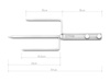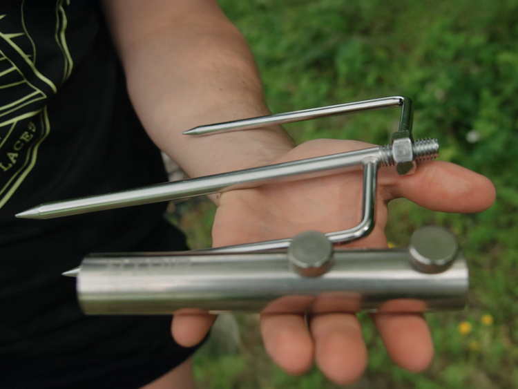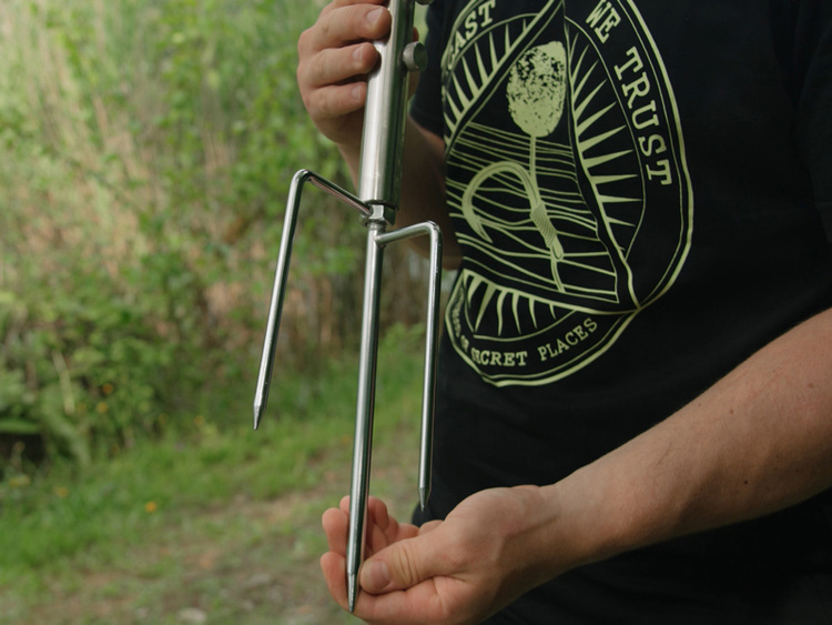 Trzy szpilki gwarantują maksymalną stabilność, a ich kształt tworzy wygodną strefę docisku stopą – umożliwiając łatwe wbicie uchwytu w twarde podłoże. Groty posiadają chromowaną powłokę, która zwiększa ich odporność na zużycie i korozję. Jedna z szpilek wyposażona jest w śrubę zaciskową, co pozwala na regulację jej położenia lub całkowite wyjęcie. Liczbę oraz rozmieszczenie szpilek można dostosować w celu jak najpewniejszego zakotwienia uchwytu w ziemi.