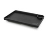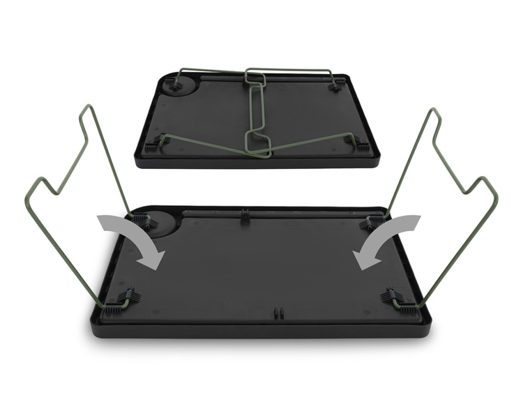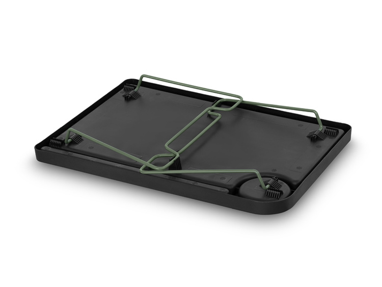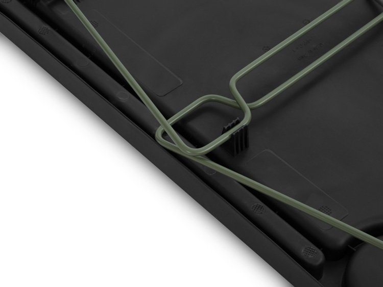 Na blacie znajduje się wąska, podłużna przegródka – idealna na akcesoria wędkarskie lub gotowe przypony, które chcesz mieć pod ręką i zabezpieczyć przed przemieszczaniem. Dodatkowo wbudowano okrągłą wnękę, w której można postawić kubek lub termos.