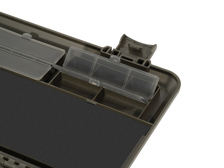 Górna część organizera przeznaczona jest do przechowywania drobnych akcesoriów niezbędnych przy przygotowywaniu przyponów. Zamykane przegródki o różnych rozmiarach zapewniają przejrzystość i porządek. Dzięki przezroczystym pokrywom poszczególnych przegródek zawsze będziesz mieć podgląd zawartości.