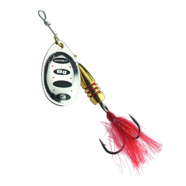 Błystka typu Aglia. Dzięki swojemu kształtowi generuje intensywne wibracje, które skutecznie wabią ryby nawet z dużych odległości. Doskonale sprawdza się zarówno na jeziorach, jak i na rzekach, również podczas prowadzenia z prądem. Świetnie pracuje przy wolnym prowadzeniu, co pozwala skutecznie używać jej także na płytkich łowiskach. Dodatkowy akcent w postaci chwosta znacząco zwiększa jej atrakcyjność. Wyposażona jest w kotwicę VMC.