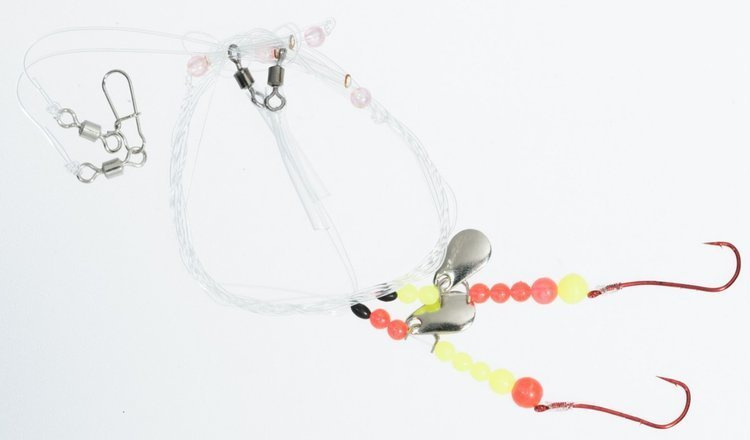 W komplecie znajdują się dwa troki z ciemnymi hakami do uzbrojenia przynęty, agrafka oraz krętlik do przyczepienia zestawu do żyłki głównej.