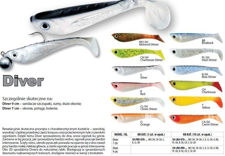Rewelacyjnie skuteczna przynęta diver z robinsona o charakterystycznym kształcie – szerokiej, wysokiej i ciężkiej przedniej części korpusu oraz przecienionym tyle z szerokim ogonkiem. Dzięki temu Diver sprowadzony do dna, unosi ogonek ku górze. Zarówno w tej pozycji, jak i prowadzony bardzo wolno, ogonek pracuje bardzo intensywnie. Ścięty ostro, szeroki pyszczek pozwala na oparcie się o dno nawet przy bardzo małej i lekkiej główce, a cienki ogonek pracuje w górze intensywnie. Oko 3D upodabnia Divera do naturalnej rybki. Występują w sprawdzonych dwunastu najłowniejszych kolorach, dostępne również w wersji z brokatem.