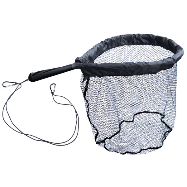 Bardzo praktyczny podbierak dla muszkarzy i spinnigistów. Nienasiąkliwa, szybkoschnąca gumowana siatka minimalizuje zaczepianiasię zestawów i sztucznych przynęt. Półokrągła rama podbieraka wyłożona gąbką jest na tyle duża, że wraz z pojemnym, głębokim koszem pozwala na lądowanie dużych ryb. Wygodna, długa rączka podbieraka dobrze leży w dłoni a dwa metalowe klipsy na gumce pozwalają zaczepić podbierak o klamrę na kurtce czy kamizelce.