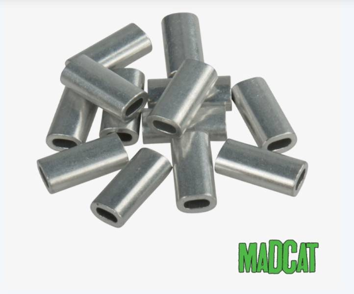 Owalne tuleje zaciskowe aluminiowe dostępne w dwóch rozmiarach 1.0 oraz 1.3 mm ( idealnie pasujące do linek 1.0 i 1.3 mm madcat ultra soft leader mono )