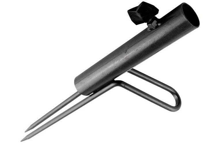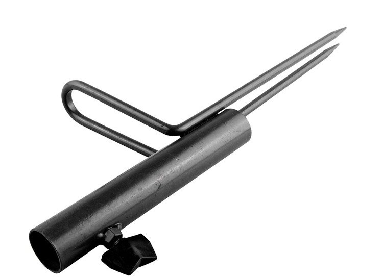 Funkcjonalny dodatek do mocowania parasola wędkarskiego w wyjątkowo twardym gruncie. Uchwyt z dwoma szpikulcami ułatwiającymi wbicie w ziemię.