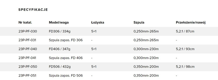 | Nr katal. | Model/waga | Łożyska | Szpula | Przełożenie/nawój | |