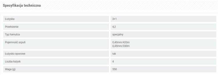 Pół kilogramowy kołowrotek mieszczący 500 metrów plecionki 0.20 mm, oparty konstrukcyjnie o 11 mocnych łożysk, zapewnia komfort wędkowania i holowania nawet bardzo silnych ryb z odległych, trudnych miejscówek! Przełożenie 5:5 do 1 pozwala na szybsze zwijanie linki. Aluminiowe szpule typu long cast zmniejszają opory tarcia podczas zarzucania nawet o 20 %. Wielostopniowa regulacja hamulca głównego i systemu wolnego biegu pozwala na dowolne modyfikacje w stosunku do warunków panujących na łowisku jak i pogody. Duże, gumowane i modelowane uchwyty podwójnej raczki zapewniają jej pewny chwyt. Rączka działa także, jako anty balans. Bardzo istotne jest pokrycie rolki kabłąka tytanem, co zabezpiecza ją przed mechanicznymi mikro uszkodzeniami niszczącymi nawijaną plecionkę lub żyłkę. Kołowrotek pozwala na łowienie wielu gatunków ryb różnymi metodami gruntowymi z karpiami na czele.