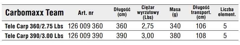 Carbomaxx Team Tele Carp. Mocna karpiówka wykonana (Lbs) z kompozytu wzmacnianego matą z włókna węglowego. Wędzisko charakteryzuje duża sztywność blanku przy niskiej wadze, wysoka tolerancja na przeciążenia i uszkodzenia mechaniczne. Wędka jest również doskonałym narzędziem do połowu drapieżników na żywą lub martwą rybkę.