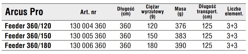 Arcus Pro Feeder. Wędki z drgającą szczytówką typu feeder to (9) twórcze rozwinięcie idei łowienia ryb z dna, zarówno rzek, jak i jezior. Bodaj najczęściej poszukiwaną długością jest 360 cm, która pozwala względnie spokojnie obławiać rzeki i jeziora. Wychodząc naprzeciw tym potrzebom, oddajemy Wam wypróbowane wędziska o zróżnicowanych ciężarach wyrzutowych, które umożliwią obsłużenie zarówno lekkich, jak i ciężkich zestawów przeznaczonych do łowienia w bystrym nurcie.