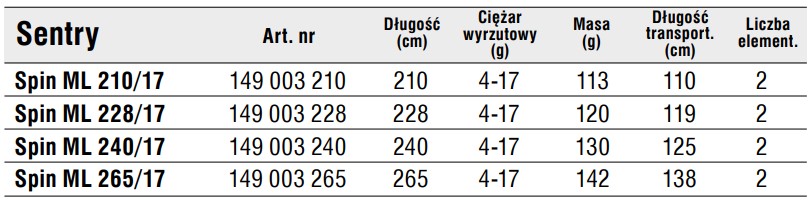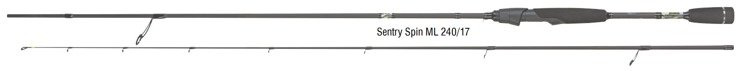 Sentry Spin ML. Zakres długości od 210 cm do 265 cm pozwolą na łowienie niemal w każdych warunkach. Wersje 210 cm i 228 cm dedykowane są do połowu z łódki natomiast dłuższe 240 cm i 265 cm sprawdzą się przy połowach z brzegu. MLki doskonale radzą sobie z wirówkami w rozmiarze 3, gumami uzbrojonymi w 12 g główki, wirującymi ogonkami i średniej wielkości woblerami. Konstrukcja i moc tego modelu powodują że podczas wyrzutu przynęty wędka ładuje się niezwykle głęboko, co pozwala na posłanie wabika nawet do 20% dalej niż innymi wędkami o podobnych parametrach.