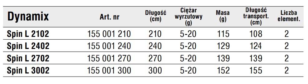Dynamix Spin L. Klasyczne lekkie spinningi dobrze spisujące się podczas połowu w niewielkich rzekach, kanałach i jeziorach. Doskonale nadają się do łowienia woblerami do 10 cm, obrotówkami 1-3 oraz lżejszymi wahadłówkami. Akcja wędki pozwoli oddać celny i dynamiczny rzut oraz zapanować nad walczącą rybą